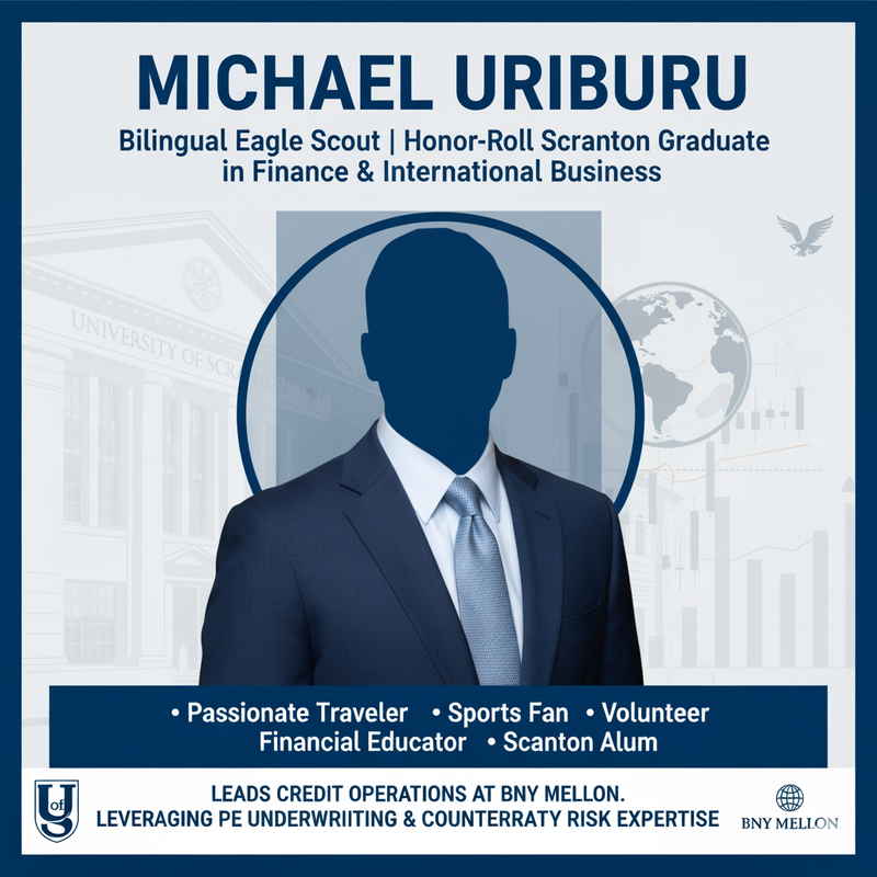 A Scranton alum, Michael Uriburu leads credit operations at BNY Mellon, leveraging PE underwriting experience and counterparty risk expertise.
